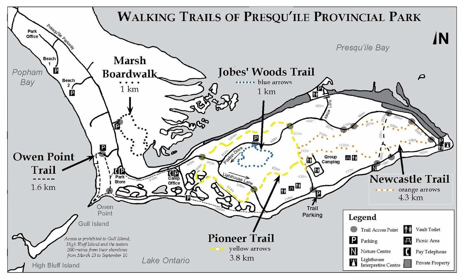 Key trailheads and visitor centres appear on park maps. Notable trails include Jobes’ Woods Trail, Owen Point Trail, and Marsh Boardwalk.