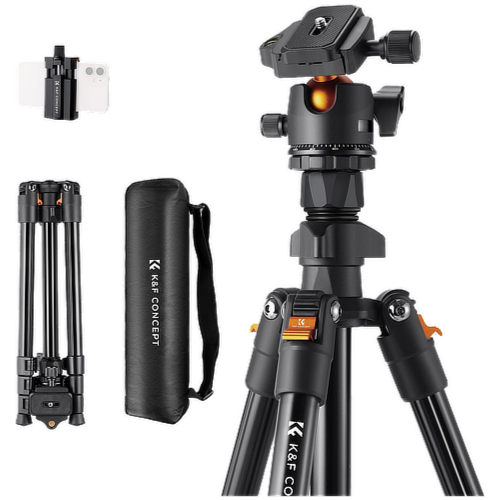 Lightweight aluminum tripod with a metal ball head, quick release plate, and phone holder. Supports up to 8kg and extends to 163cm. I use this tripod for general outdoor photography, including landscapes and long exposures